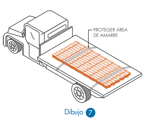 • Utilizar un camión con plataforma plana, estable y libre de objetos que puedan dañar la lámina, la longitud de esta plataforma debe ser mayor o igual que la longitud de la lámina a transportar (ver Dibujo 7).