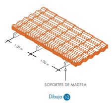 • Nunca almacenar la lámina en contacto directo con el suelo, sino colocar sobre soportes de madera (no metal, porque puede dañar la lámina) a nivel con 1.00 metro de separación (ver Dibujo 10).
